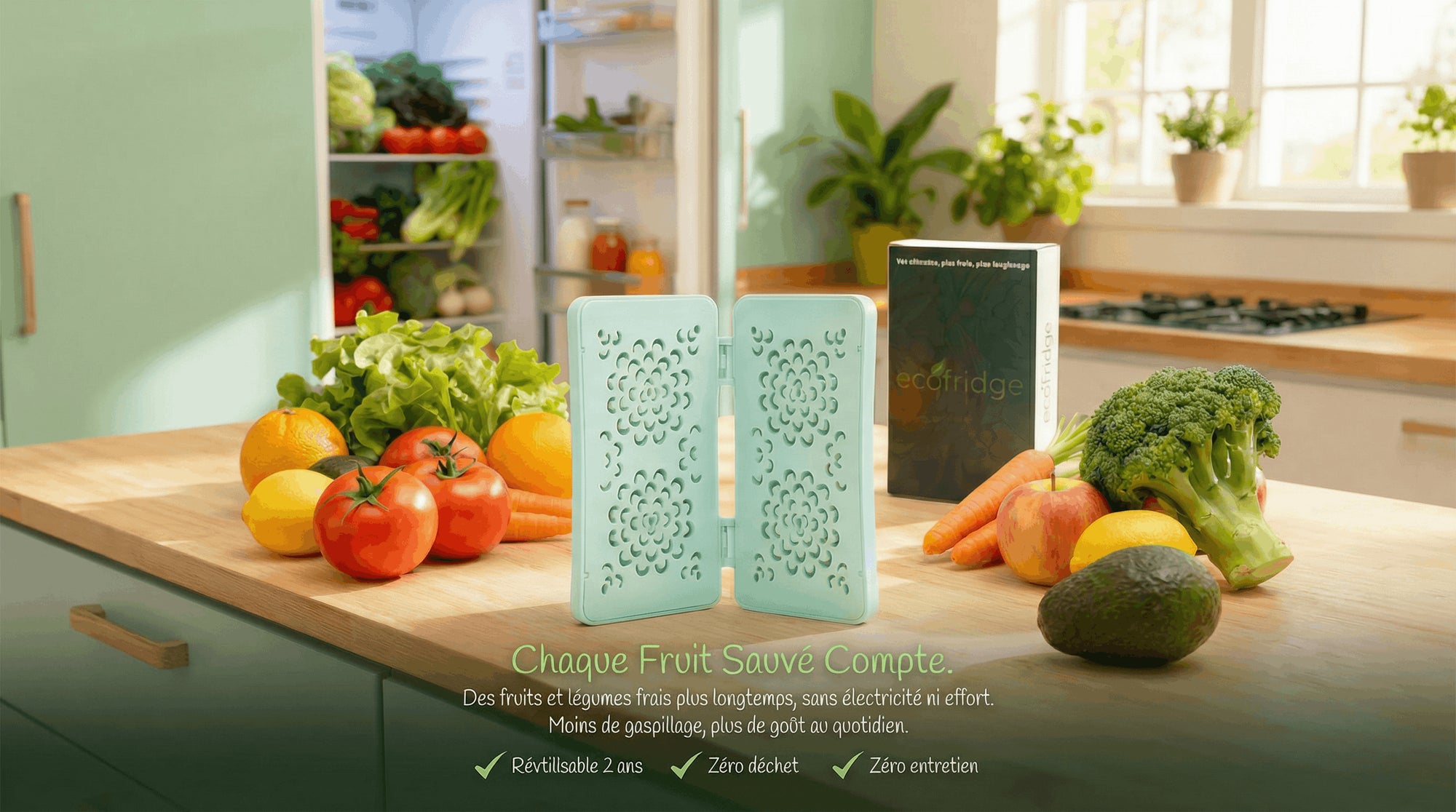 Ecofridge agit discrètement dans votre réfrigérateur pour prolonger la vie de vos aliments.