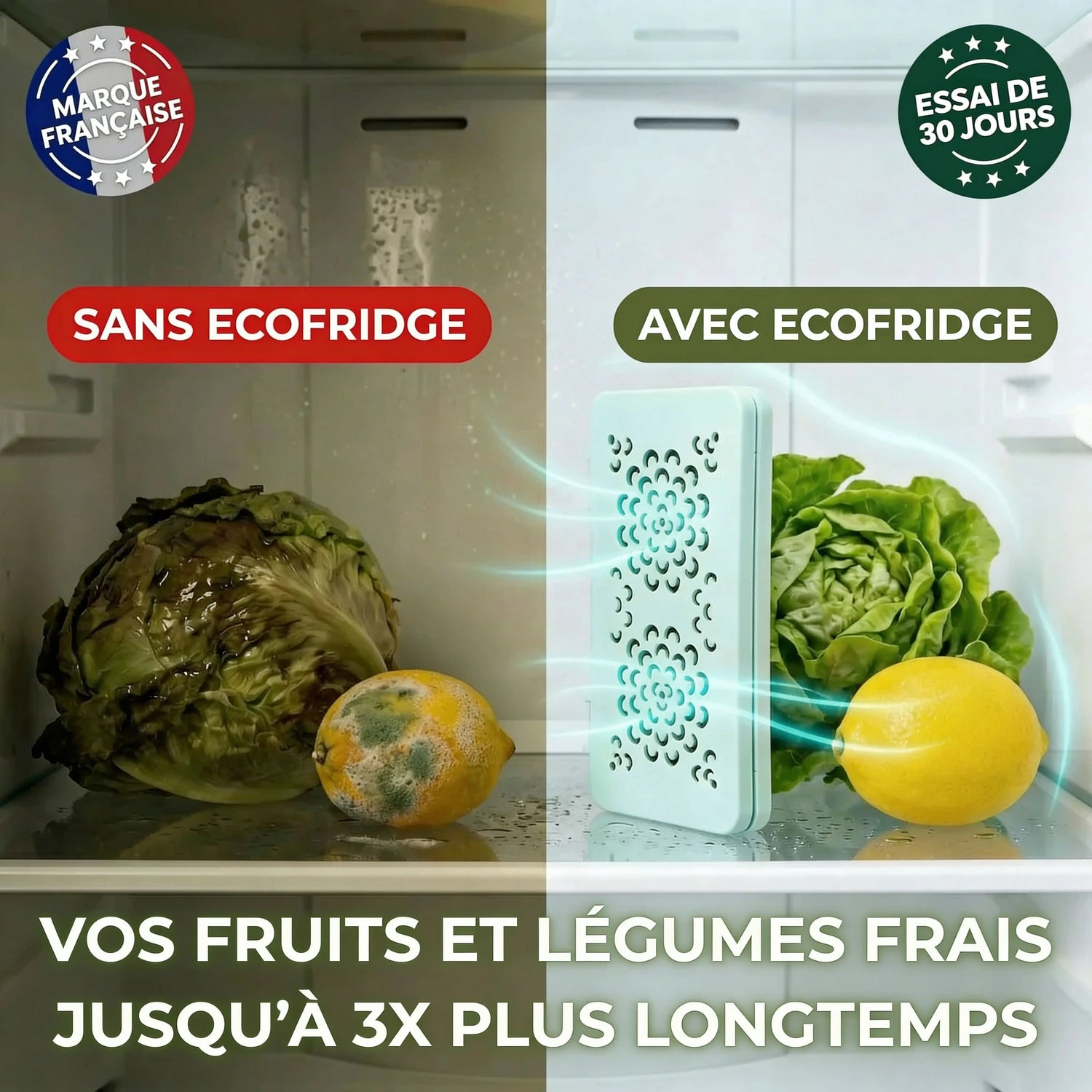 Le filtre Ecofridge absorbe les gaz responsables du mûrissement prématuré (comme l’éthylène) et limite la prolifération bactérienne, permettant à vos aliments de rester frais jusqu’à 2 à 3 fois plus longtemps.