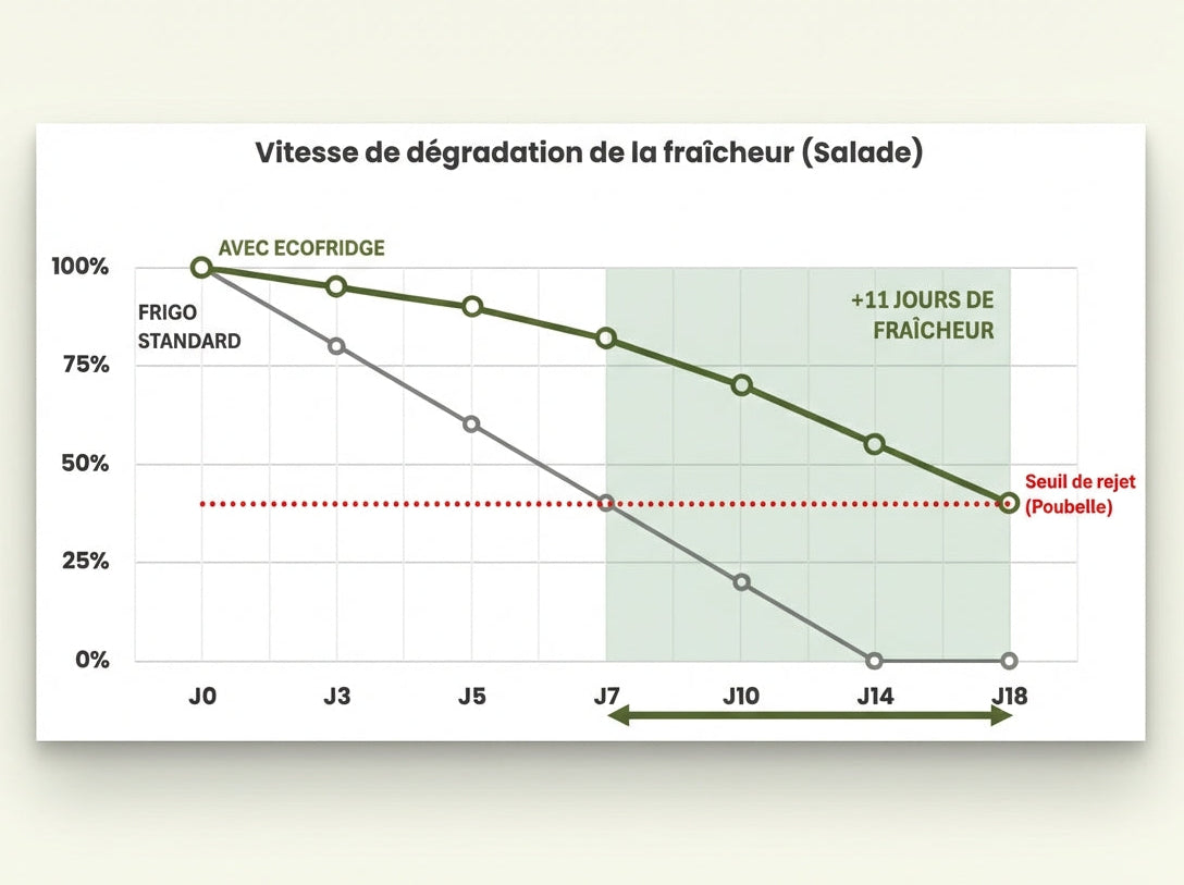 Oui. Contrairement aux boîtes hermétiques qui isolent seulement, Ecofridge agit activement grâce à sa technologie de fibre à charbon actif. Il absorbe le gaz éthylène responsable du mûrissement et offre une conservation supérieure aux simples sachets jetables.